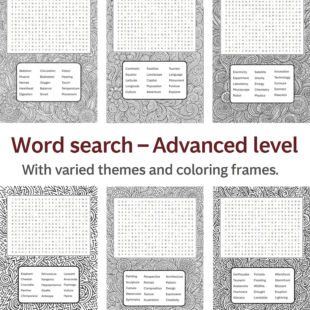 Challenge your students or yourself with six printable advanced word search puzzles featuring unique and creative coloring frames! Each page introduces a distinct theme – like wild animals, science and the human body.
